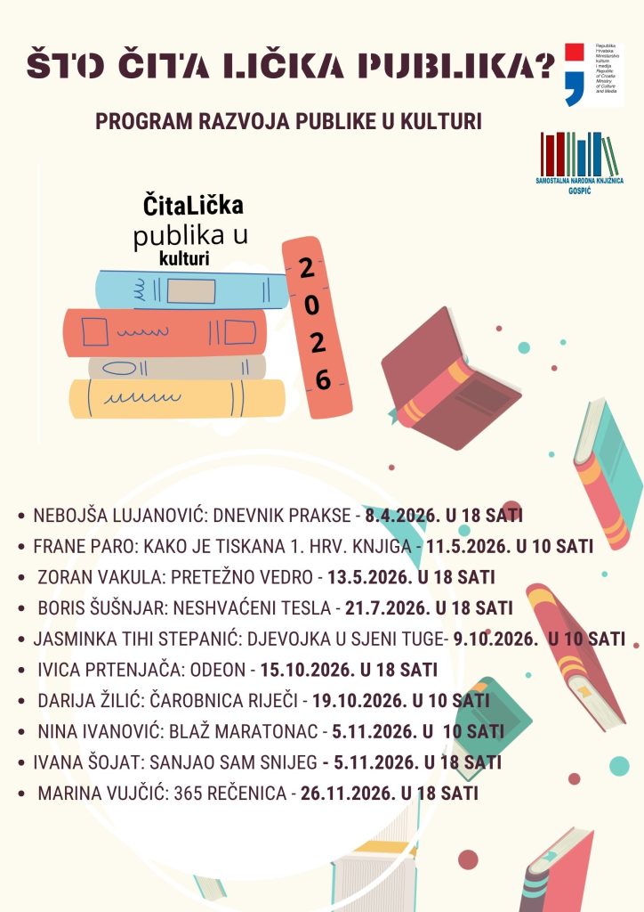 Samostalna narodna knjižnica Gospić za program razvoja publike u kulturi 2026. godine oblikuje program pod nazivom ČitaLička publika u kulturi. Program je osmišljen s ciljem unapređenja čitateljskih navika, jačanja kulturne participacije i povećanja dostupnosti kvalitetnih književnih, vizualnih i edukativnih sadržaja širokom krugu korisnika. Temelj programa čini pažljivo odabran korpus suvremenih hrvatskih autora i njihovih djela koji obuhvaćaju različite žanrove – od romana i stručnih knjiga do slikovnica, stripova te književnosti za djecu i mlade i suvremene društvene teme na temelju dijela naslova liste A i B Ministarstva kulture i medija RH. Ovakav interdisciplinarni i intergeneracijski pristup omogućuje uključivanje različitih dobnih skupina, razinu čitateljskog iskustva i interesnih područja, čime se stvaraju preduvjeti za dugoročniji razvoj kulturne publike te time doprinosi oblikovanju informirane, aktivne i kulturno osviještene publike te predstavlja važan korak u unapređenju kulturnog života i stvaranju trajnih kulturnih navika u široj zajednici.