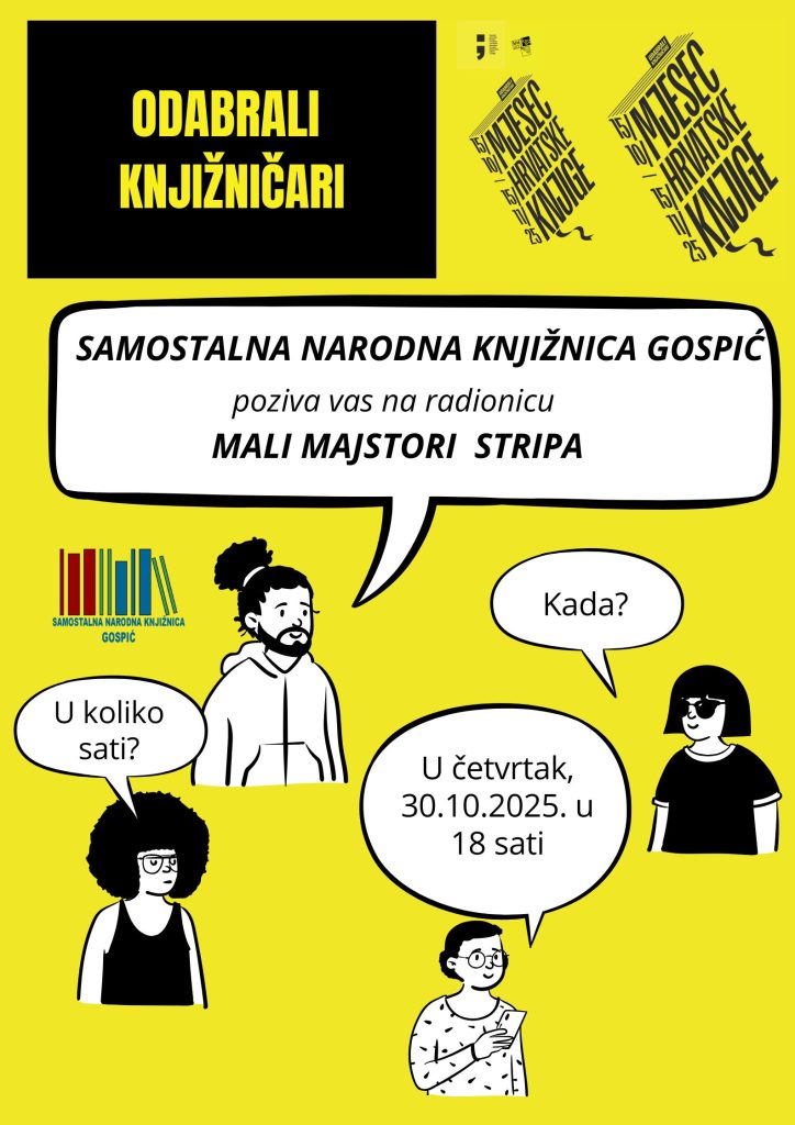 U sklopu manifestacije Mjesec hrvatske knjige 2025., Samostalna narodna knjižnica Gospić poziva vas na dječju kreativnu radionicu „Mali majstori stripa“.