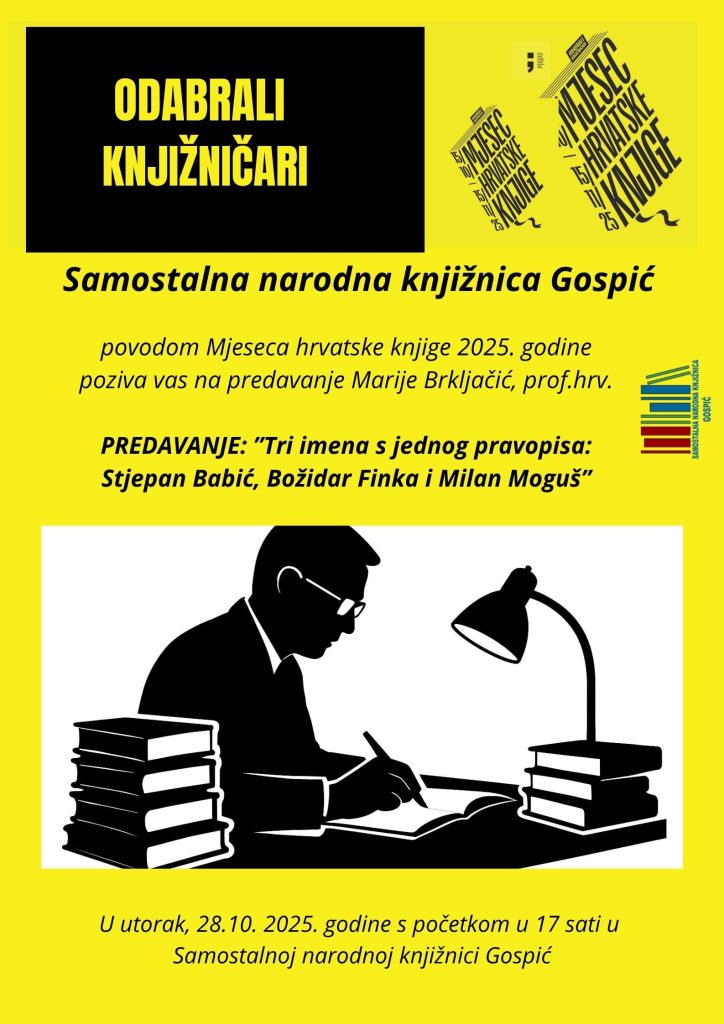 Pozivamo vas na predavanje profesorice Marije Brkljačić pod nazivom „Tri imena s jednog pravopisa: Stjepan Babić, Božidar Finka i Milan Moguš“, koje će se održati u utorak, 28. listopada 2025. godine, s početkom u 17 sati u prostoru Samostalne narodne knjižnice Gospić.